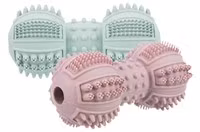 Denna apportformade tuggleksak är särskilt framtagen för valpar. De varierade strukturerna och nopporna masserar tandköttet och kan lindra obehag under tandömsning. Formen gör den lätt att greppa, bära och tugga på – perfekt för små munnar. Leksaken är ljudlös och passar därför utmärkt för lugn lek inomhus. Tillverkad i naturgummi som är både skonsamt och slitstarkt. Levereras i blandade färger.
