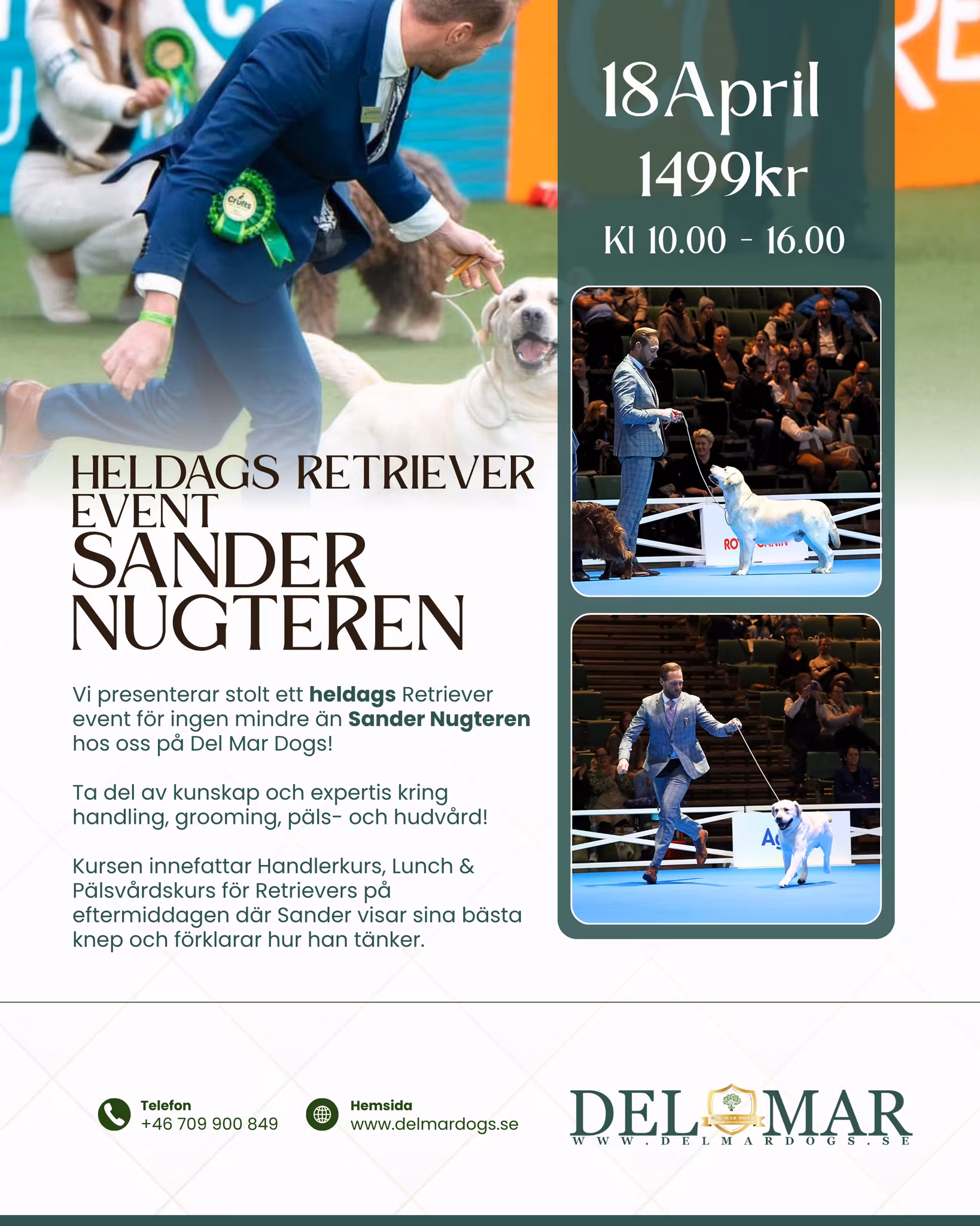 Välkommen till ett exklusivt heldagsevent för dig som älskar retrievers och vill fördjupa dina kunskaper inom handling, grooming samt päls- och hudvård. Den 18 april gästas Del Mar Dogs av den internationellt meriterade handlern Sander Nugteren, som delar med sig av sin erfarenhet, sina tekniker och sitt sätt att tänka kring presentation av retrievers på högsta nivå.