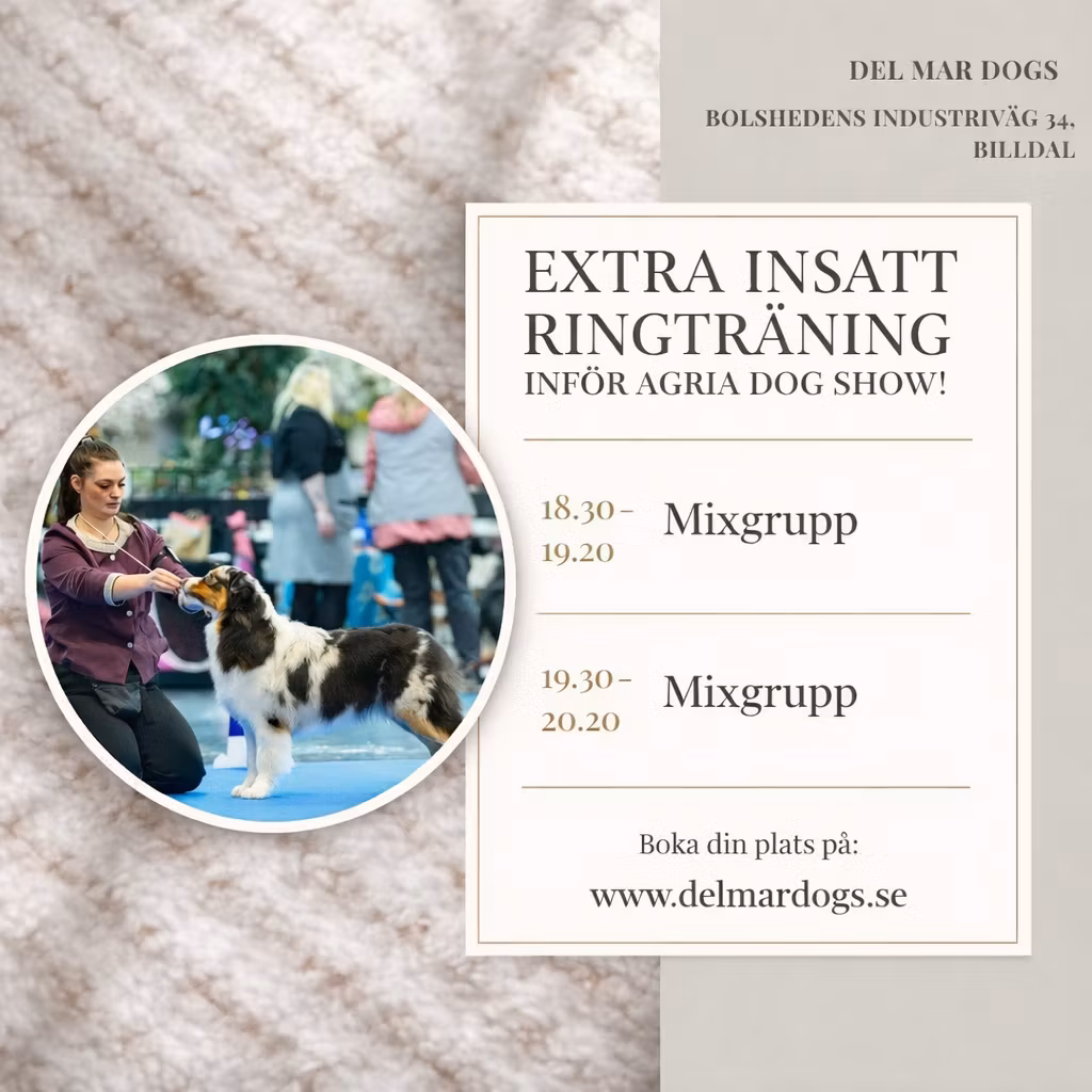 RINGTRÄNING EXTRA INSATT INFÖR AGRIA DOG SHOW / JÖNKÖPING ONSDAG 18.30-19.20 / 19.30-20.20 för Linda UlriksenRINGTRÄNINGEN HÅLLS PÅ DEL MAR HUNDARENA ; Bolshede