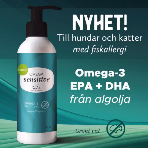 Nutrolin® OMEGA SENSITIVE™ ersätter helt lax- och fiskolja, och innehåller exakt samma omega-3 EPA- och DHA-fettsyror som de fiskoljebaserade Nutrolin®-produkterna. Till skillnad från de andra fiskoljebaserade Nutrolin®-produkterna innehåller Nutrolin® OMEGA SENSITIVE™ ändå inte andra näringsämnen, förutom naturlig E-vitamin.