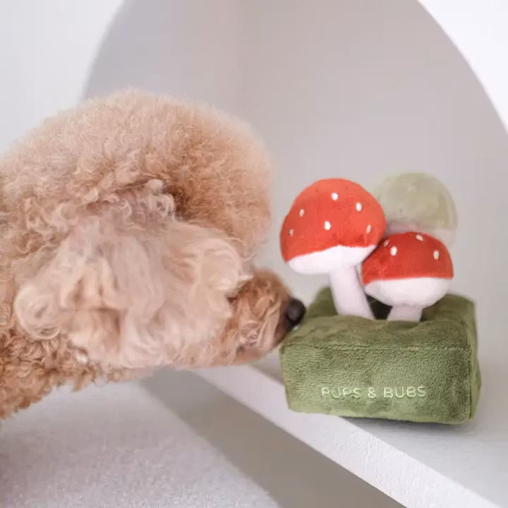 Forest Mushroom Nosework Toy, som upptäcks i världens mest exotiska regnskogar, är en i sitt slag. Med livfulla färger och delikat broderade mönster är det en magisk leksak gjord just för din valp. Basen där svampen växer är godisfickor, och det finns också en under den gröna svampen. Båda röda svamparna kommer med piper för den extra stimulansen och kul!